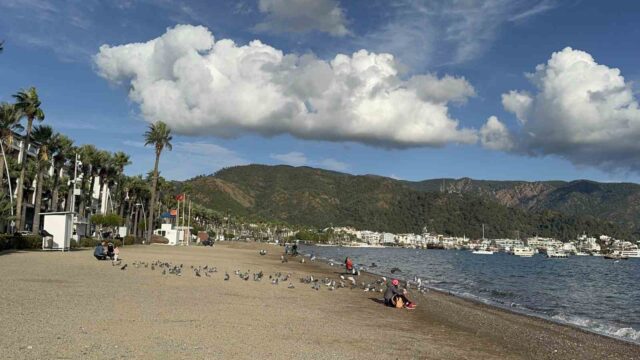 Yaz aylarında yüz binlerce turisti ağırlayan Muğla’nın Marmaris ilçesinde, kış mevsimine sayılı günler kalmasına rağmen güneşli hava etkisini sürdürüyor. Vatandaşlar, sıcak havayı fırsata çevirerek sahillere akın etti.