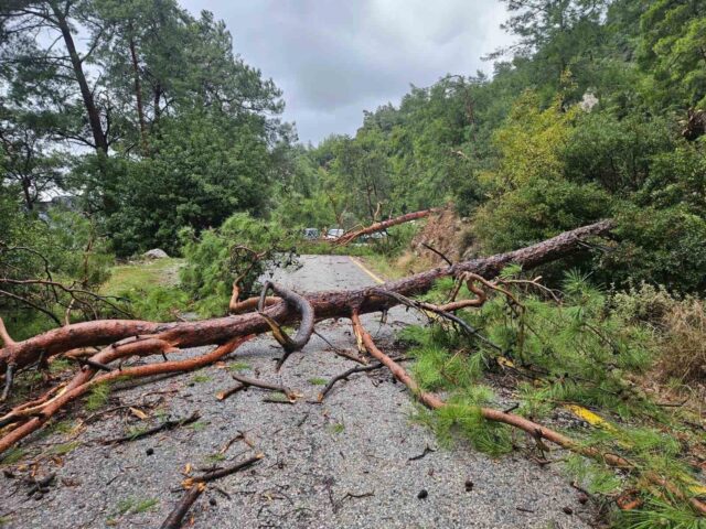 Muğla’nın turistik Menteşe ilçesine bağlı Sarnıç Mahallesi Akbük Mevkii yolunda etkili olan şiddetli yağış ve fırtına, ulaşımı felç etti. Kuvvetli rüzgarın etkisiyle 3 büyük çam ağacı yola devrildi.
