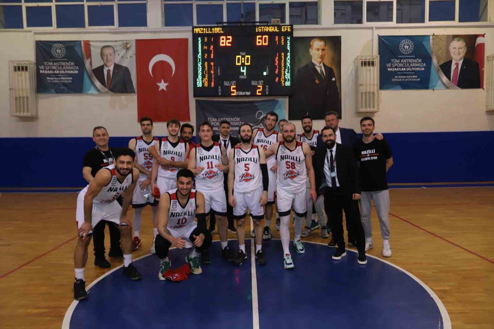 Türkiye Basketbol Erkekler 2. Ligi’nde 1. Lig’e yükselme son 16 turu ilk maçında Nazilli Kapalı Spor Salonu’nda İstanbul Efendileri Basketbol Takımı ile karşılaşan Nazilli Belediyespor Erkek Basketbol Takımı sahadan galip ayrıldı.