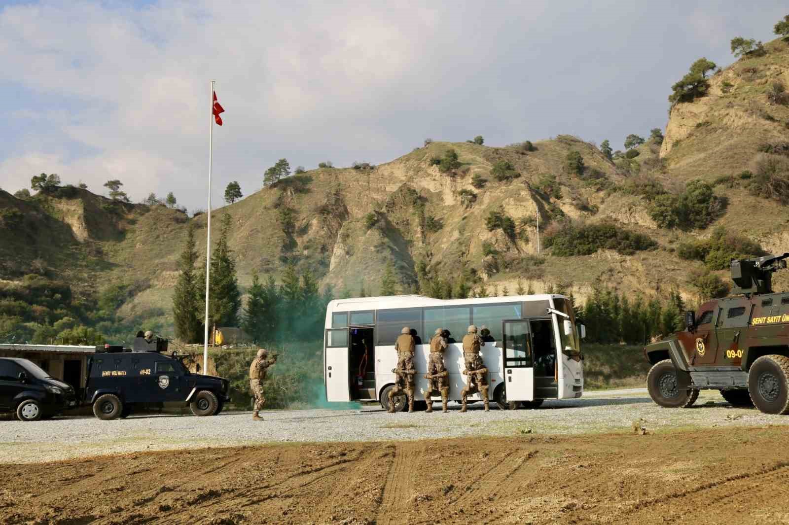 Aydın’da görev yapan özel harekat polislerinin “Ulaştırma Araçlarının Kaçırılması ve Meskûn Mahal Operasyonu” tatbikatı başarıyla gerçekleştirilirken, operasyon anında ortaya çıkan görüntüler ise gerçeğini aratmadı.