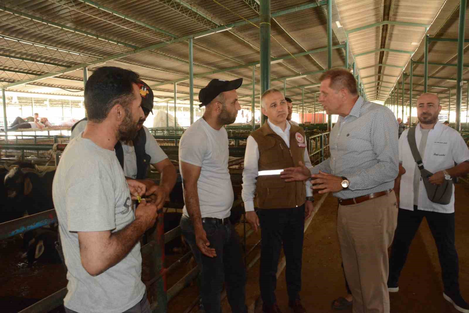 Kurban Bayramı’na sayılı günler kala, Manisa Ticaret Borsası Canlı Hayvan Borsası’nda hareketlilik devam ediyor. Manisa Ticaret Borsası Başkanı Sadık Özkasap ile Manisa Tarım ve Orman İl Müdürü Metin Öztürk canlı hayvan borsasında incelemelerde bulundu.