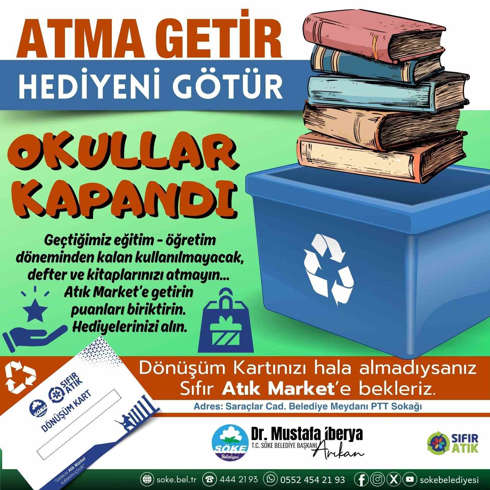 Eski defter, kitap ve benzeri kağıt atıklar Söke Belediyesi ‘Atık Market’e bırakılabilecek. Dönüşüm kartı alabilecek vatandaşlar, atıkların puana dönüşmesiyle bunun karşılığında markette bulunan hediyelerden alabilecek.