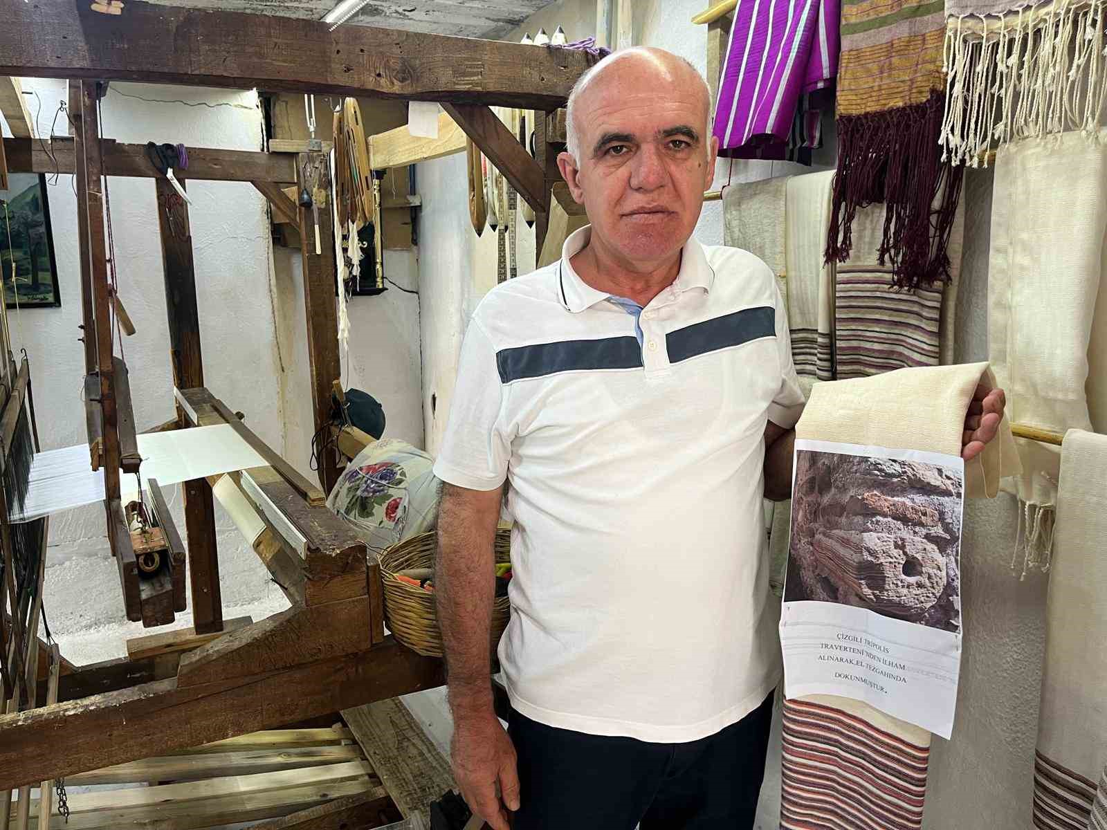Denizli’nin Buldan ilçesinde yaşayan el tezgahı ustası Veysel Karaşın, Tripolis Antik Kentinin dünyaca ünlü travertenlerini Buldan bezine dokudu.