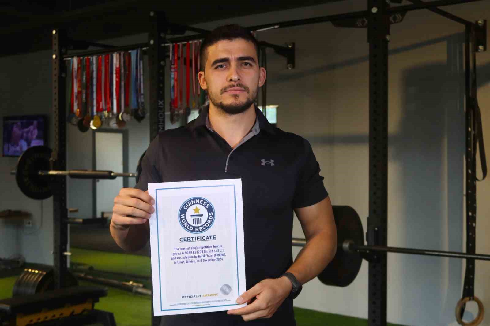 İzmir’in Bornova ilçesinde Atletik Performans Koçu olan Burak Yazgı, yıllar önce üzerine çalışmaya başladığı Turkish Get Up (Türk Kalkışı) hareketinin bir Türk’e geçmesi için rekor denemesi gerçekleştirdi. 29 yaşındaki Yazgı, 80 kilo ile İsveçli bir atlette olan rekoru 90.97 kilo ile geçmek için Guinness Rekorlar Kitabı’nın istediği ortamı oluşturup, tanıklık edecek kişilerle birlikte video çekerek görüntülü şekilde kayıt altına aldı. Turkish Get Up yani Türk Kalkışı hareketini başarılı bir şekilde yapan Burak Yazgı, kayıtları Guinness’e mail yoluyla gönderdi. Yazgı, günler sonra sevindirici haberi aldı ve Guinness Rekorlar Kitabı’na adını yazdırdı. Bu süreci İhlas Haber Ajansı (İHA) muhabirine anlatan Yazgı, “Bir onay maili bekliyordum. Guinness’te yazılan bütün detayları büyük bir titizlikle yerine getirmeye çalıştım. Videomuzu çektik, tanıklarımızı ayarladık. Her şeyi gönderdikten sonra bir onay süreci bekliyorsunuz. O onay süreci benim için çok stresli geçti. Bir gün yine burada çalışırken mail geldiğini gördüm telefonumda. Büyük bir heyecanla baktım. O an onaylandığını gördüm. Açıkçası benim için çok büyük bir mutluluk oldu” şeklinde konuştu.