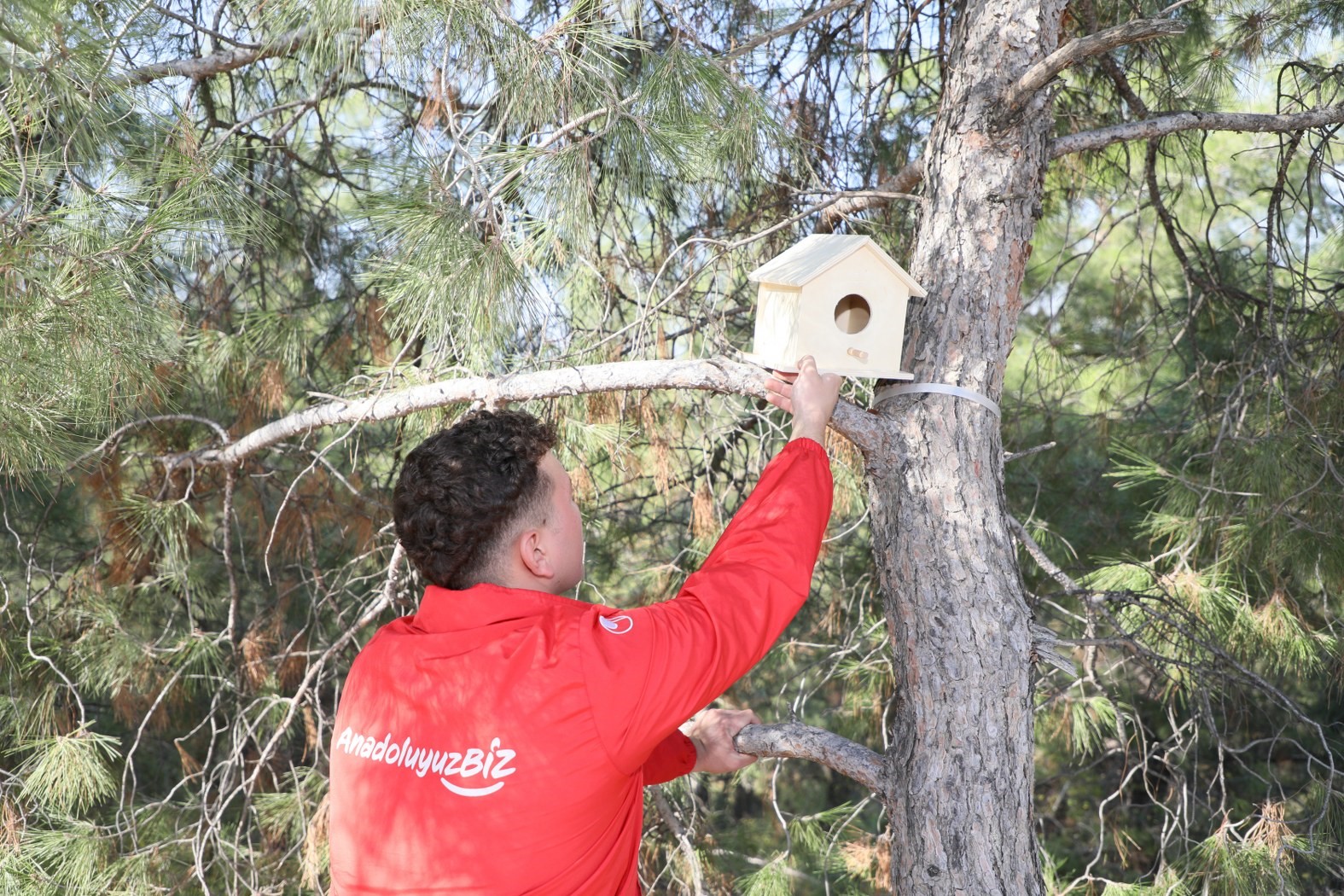 Manisa Celal Bayar Üniversitesi öğrencileri ile Yunusemre Belediyesi ve Yunusemre Kent Konseyi tarafından gerçekleştirilen çevre etkinliğinde kendi yaptıkları kuş evlerini ağaçlara asarken bir taraftan da çevre temizliği yaptı.