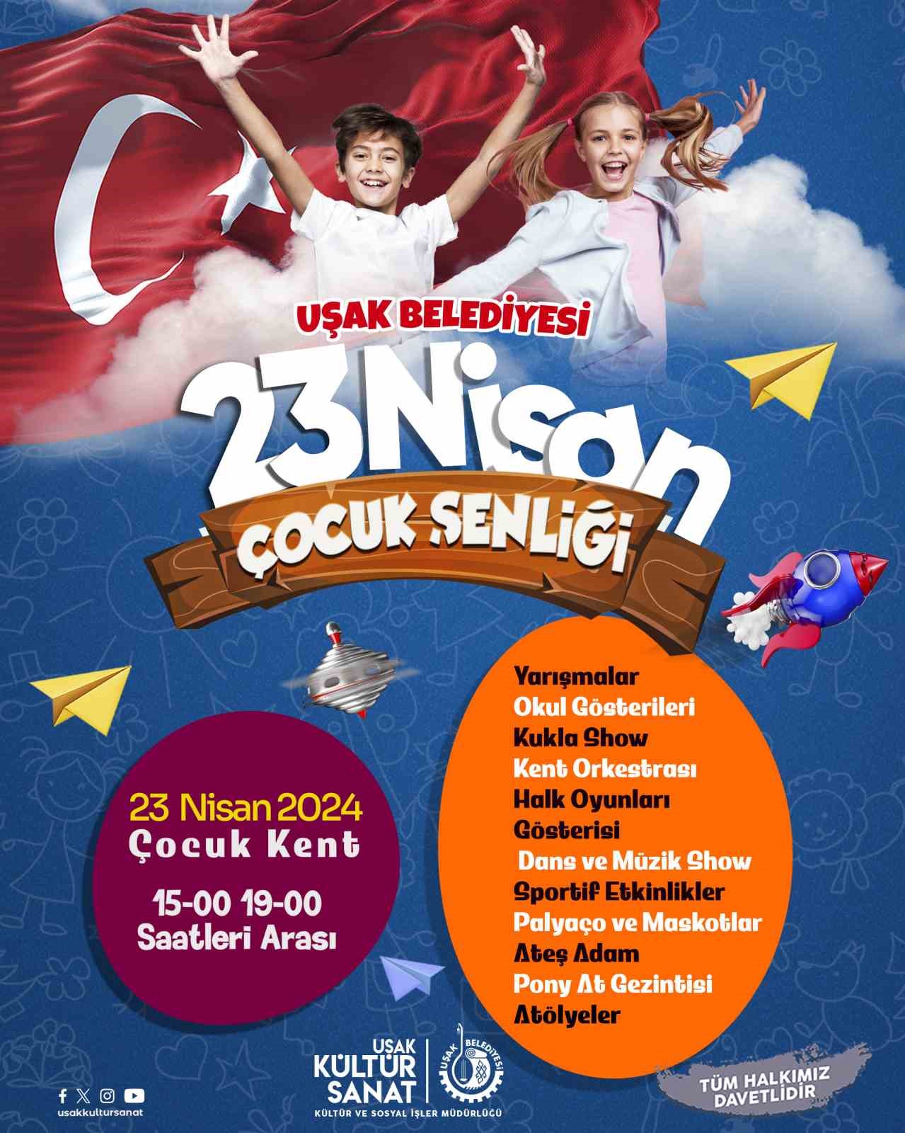 Bu önemli günün coşkuyla kutlanmasını hedefleyen Uşak Belediyesi, düzenleyeceği ‘23 Nisan Çocuk Şenliği’ ile her yaştan vatandaşın yüzünü gülümsetecek. 23 Nisan Salı günü 15.00 ile 19.00 saatleri arasında yapılacak programda ayrıca Uşak Belediyesi Kent Orkestrası sahne alacak ve Nihat Dülgeroğlu İlkokulu 2. sınıf öğrencileri gösteri yapacak.
