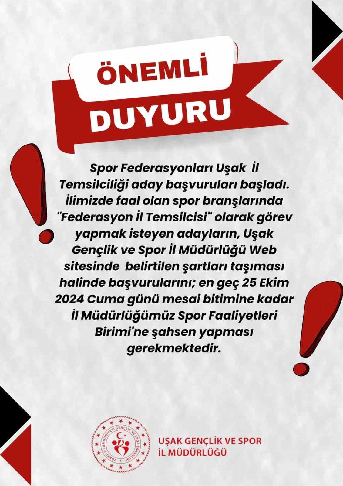 Uşak Gençlik ve Spor İl Müdürlüğü yapmış olduğu duyuruda Uşak’ta faal olan spor branşlarında Federasyon İl Temsilciliği başvurularının başladığını duyurdu. Gençlik ve Spor İl Müdürlüğü sosyal medya hesaplarından yapıla paylaşımda ise; “Spor Federasyonları Uşak İl Temsilciliği aday başvuruları başladı. İlimizde faal olan spor branşlarında “Federasyon İl Temsilcisi” olarak görev yapmak isteyen adayların, Uşak Gençlik ve Spor İl Müdürlüğü resmi sitesinde belirtilen şartları taşıması halinde başvurularını; en geç 25 Ekim 2024 Cuma günü mesai bitimine kadar Sportif Değerlendirme ve Takip Birimine başvuru evraklarını teslim etmesi gerekmektedir.” ifadeleri kullanıldı.