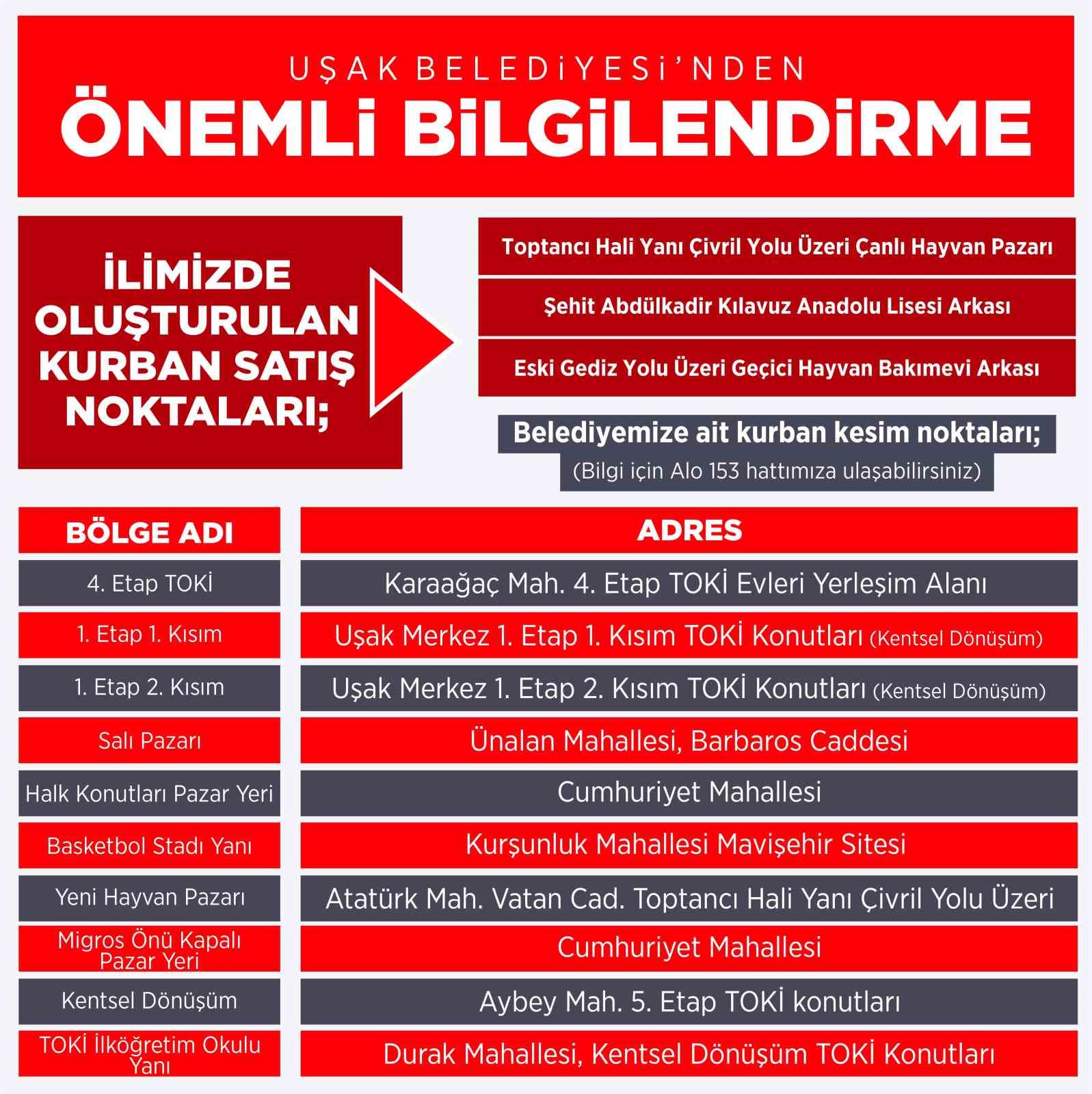 Kurban Bayramı öncesi üç farklı noktada oluşturulan kurban pazarını, vatandaşların kurbanlarını kesebilecekleri on farklı noktayı ve bunların yanı sıra sakatatlar için oluşturulan üç farklı çukurun adresini vatandaşlara duyuran Uşak Belediyesi, aynı zamanda kamu alanlarında kötü koku ve görüntülerin oluşmaması adına çağrıda bulunarak, kurban süresince vatandaşları duyarlı olmaya davet etti.