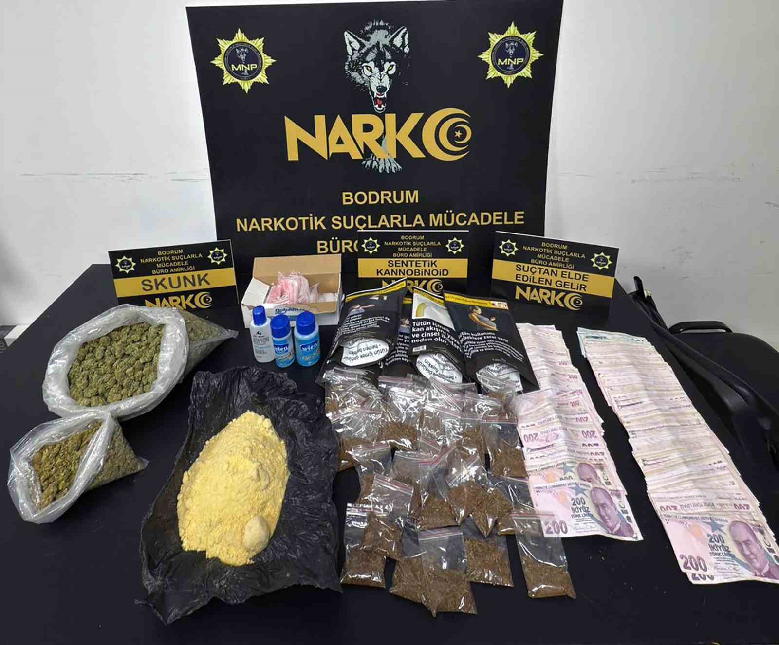 Yapılan operasyonlarda, 745 gram skunk, 577 gram pinaca (sentetik kannabinoid hammaddesi), 255 gram bonzai, 98 gram kokain, 34 gram esrar, 28 gram metamfetamin, 15 adet sentetik ecza, 2 adet A4 kağıda emdirilmiş sentetik kannabinoid (bonzai), ruhsatsız tabanca, kurusıkı tabanca, 17 adet fişek, suçtan elde edildiği değerlendirilen 181 bin 400 TL, 200 Dolar, 50 Euro para ele geçirdi.