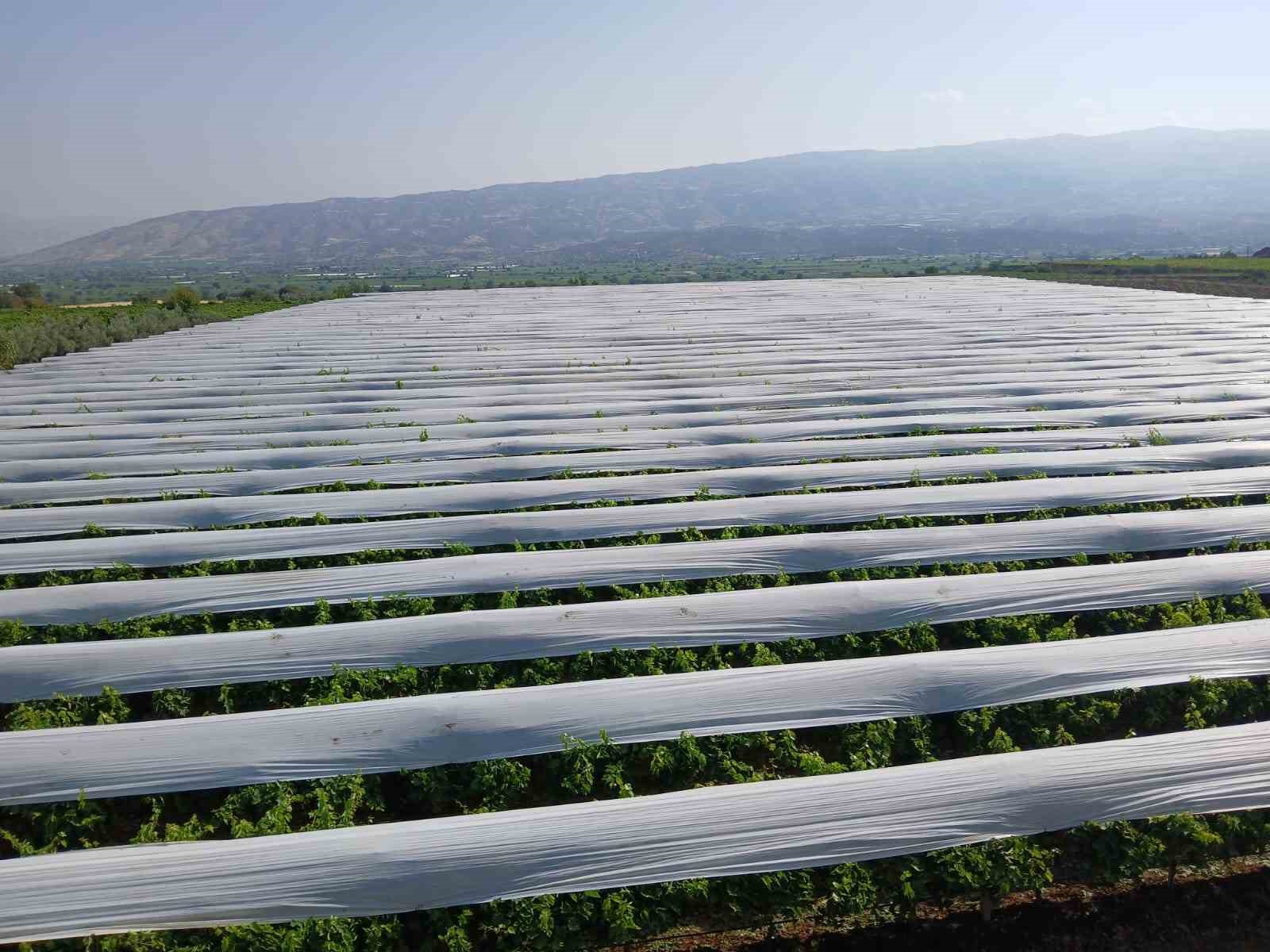 Manisa’nın dünyaca ünlü sofralık Çekirdeksiz Sultaniye üzüm bağlarının üstleri beyaz kanaviçelerle örtülmeye başlandı. Ağustos ayında hasadına başlanacak olan üzümler örtü sayesinde aralık ayının sonuna kadar dalında tazeliğini korurken, doğa olaylarına karşı da tedbir alınmış oluyor.