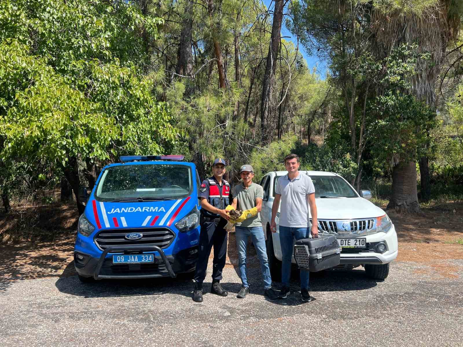 Aydın’ın Bozdoğan ilçesinde jandarma ekiplerince bulunan yaralı şahin, doğa koruma ekiplerine teslim edildi.
