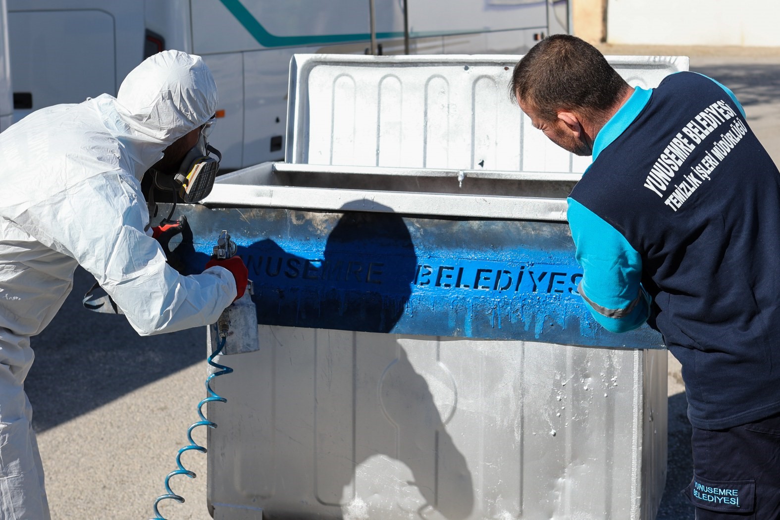 Yunusemre Belediyesi, ilçe genelinde bulunan çöp konteynerlerinde dezenfekte ve bakım onarım çalışması yapıyor.